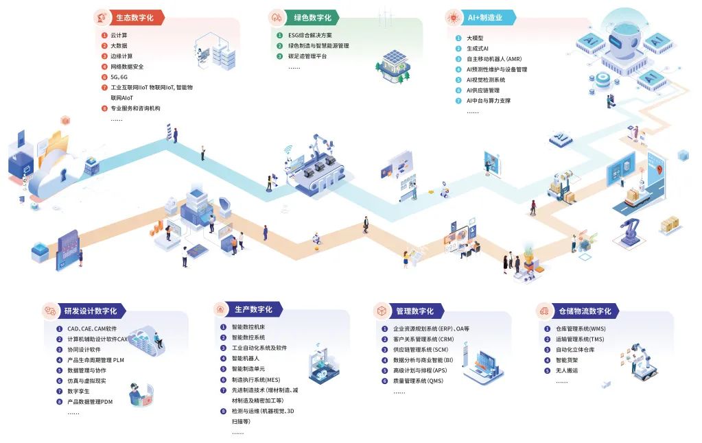 从管理数字化(ERP、CRM等系统)、生产数字化(智能机床、工业机器人等)到绿色数字化(ESG解决方案、碳足迹管理等),涵盖研发设计、生产制造、仓储物流等全环节,全方位展示数字化转型成果。